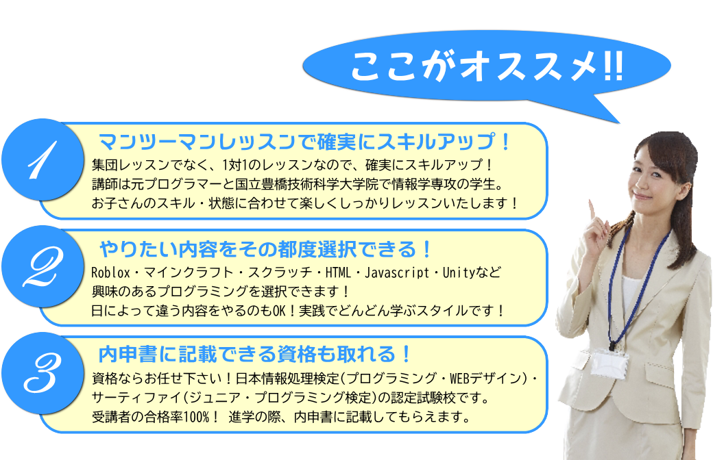 沢山のお子さんが資格にチャレンジしています。 当校受講者の合格率100%です!進学の際、内申書に記載してもらえます。 サーティファイ ジュニア・プログラミング検定 公式サイト