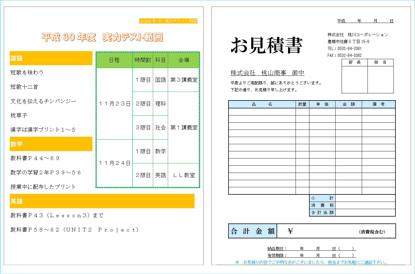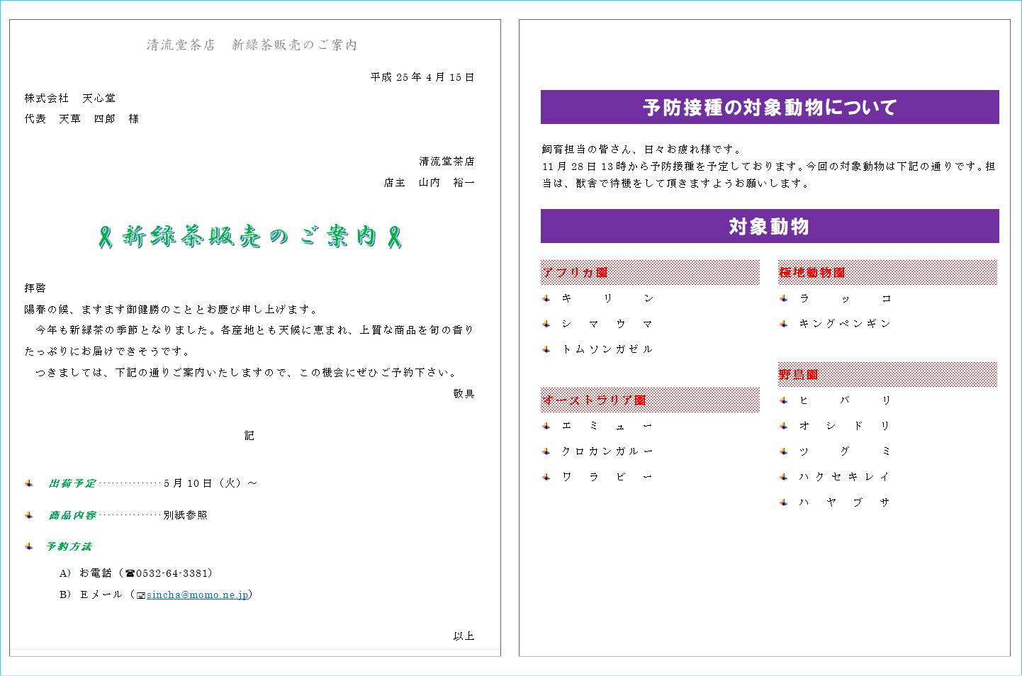 前半は、文字の入力から始まり、文字の装飾や配置で見やすい文書を作成します。スタイルの設定やインデント、罫線を入れ、Wordの基礎的な文書作成機能の学習をします。
