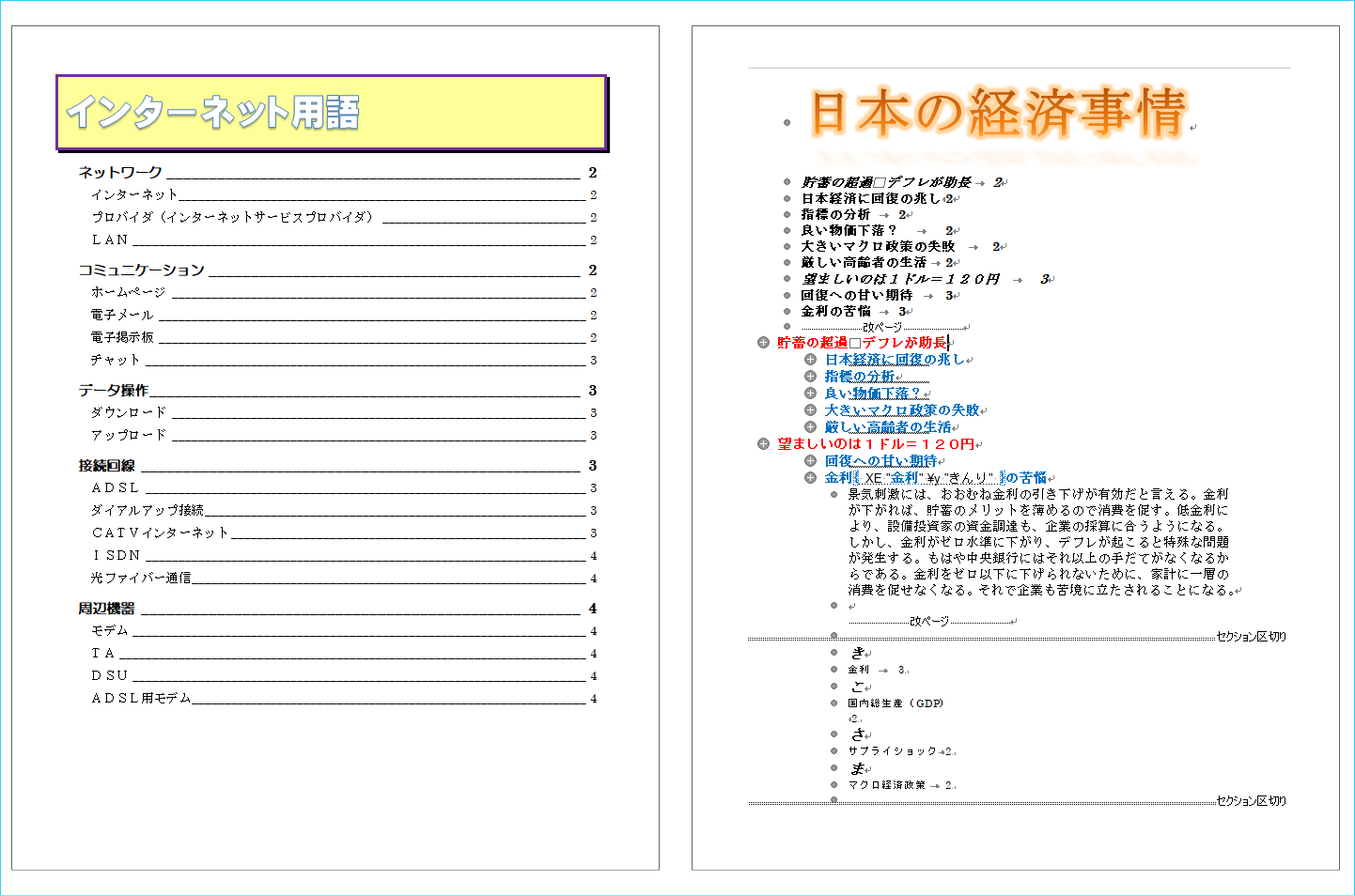 中盤は、アウトラインについて学習します。目次や索引・脚注を入れる事により、長文の構成が分かりやすくなり、管理・編集が容易になります。