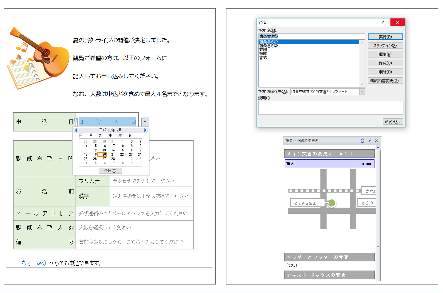 後半は、差し込み印刷・マクロ・フォームとコンテンツコントロールについて学習します。よく使う操作をマクロで記憶させておくことにより一括操作できるようになり、作業効率が上がります。
